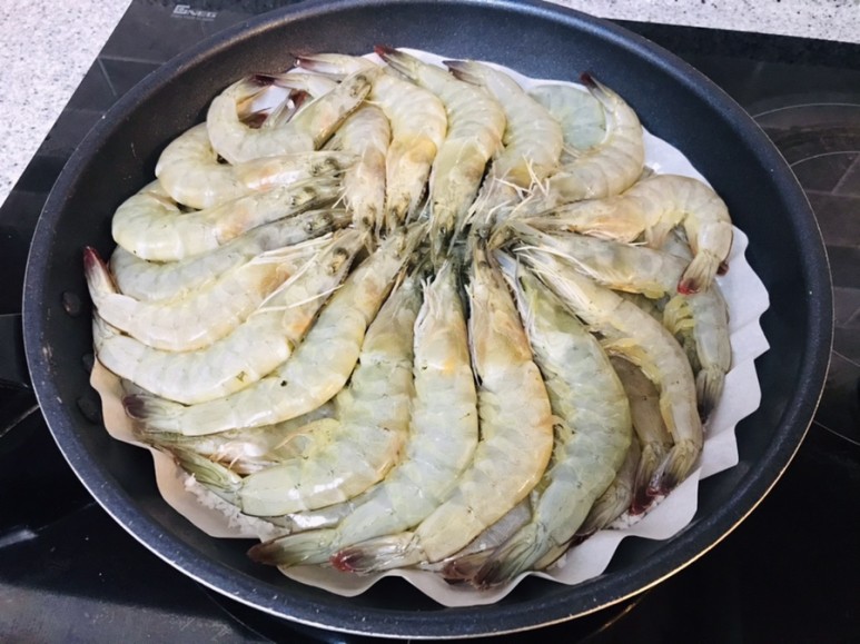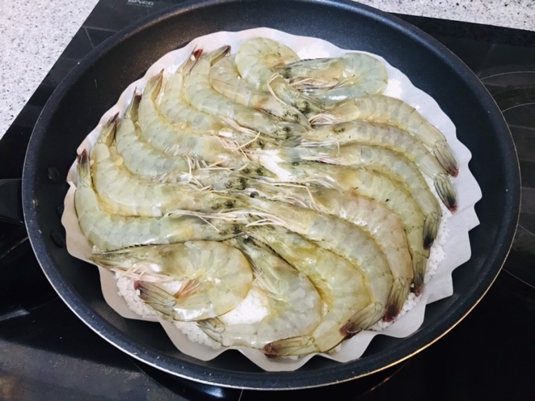 굵은소금 위에 손질한 새우들을