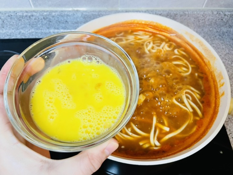 칼국수 면이 반 정도 익었을 때 계란 2알을