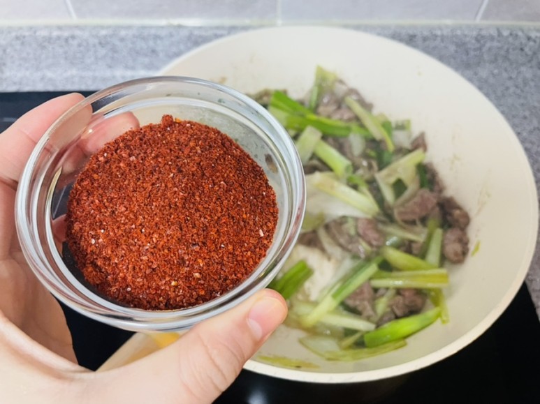 고춧가루4T를 넣고 볶아 고추기름을 내준 후