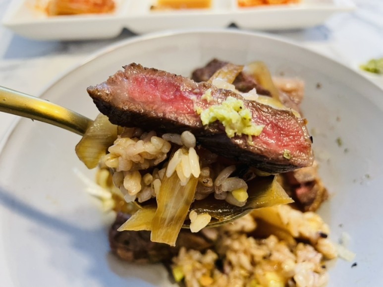 스테이크 한 점, 와사비 살짝 얹어서 먹으면