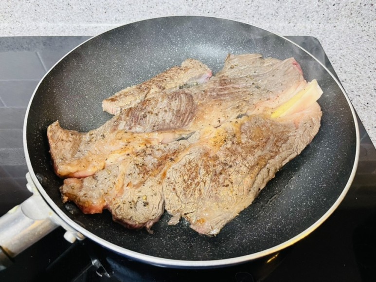 두께가 두꺼운 고기는 팬이 달궈지기 전에 굽고