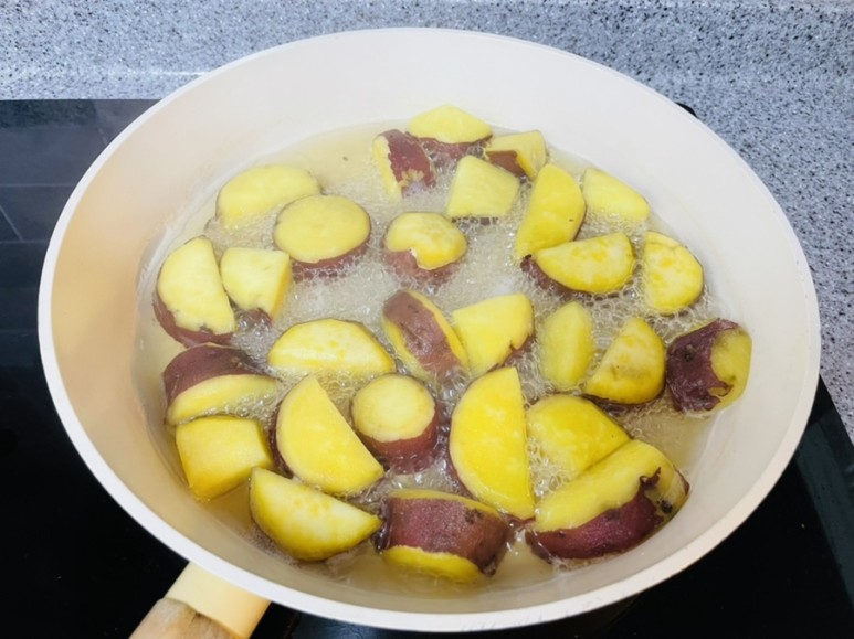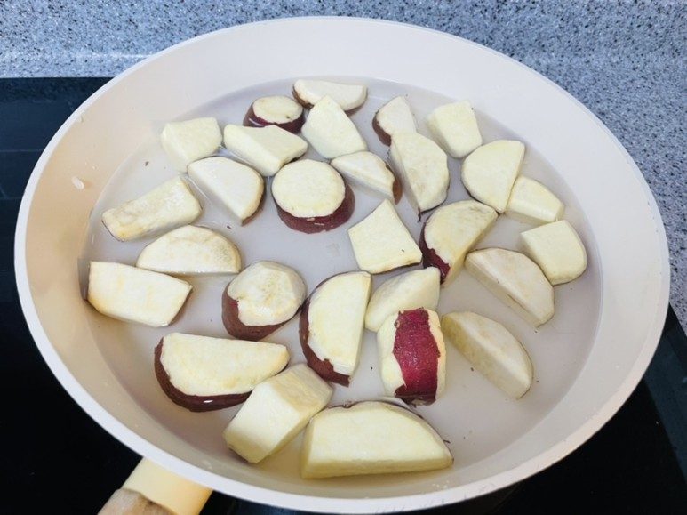 프라이팬에 물 2컵과 손질해 놓은 고구마를