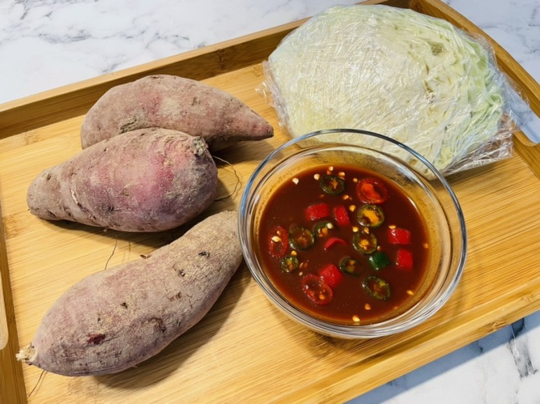 고구마 3개, 양배추, 고추장2T, 진간장2T,