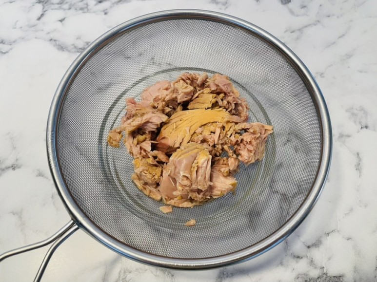 캔참치 135g 한 캔을 채에 받쳐서 기름을 빼고