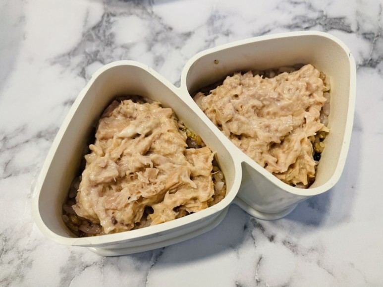 가운데 위주로 참치마요를 1/3높이로 담아주세요