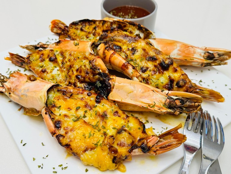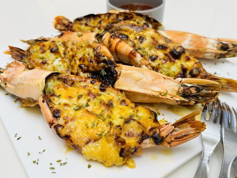 노릇하게 구워진 새우구이를 접시에 담아주고