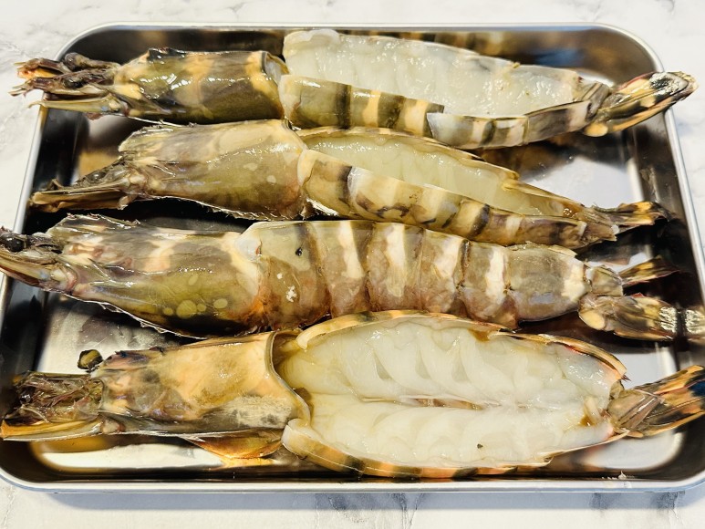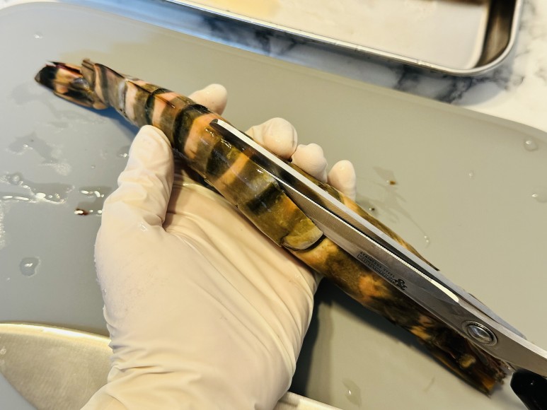 잘라준 후 칼로 새우 등을 갈라 벌려 새우 등에 있는