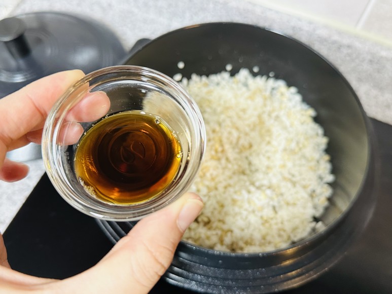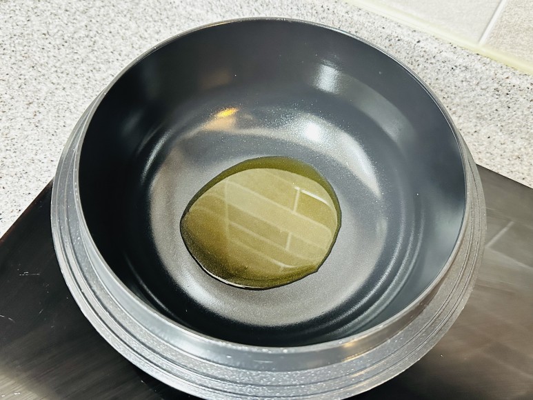 솥 냄비에 참기름 1T와 불려놓은 쌀을 넣고