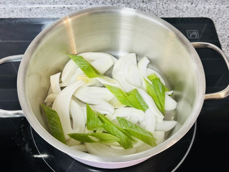 큼직하게 어슷 썰어 바닥에 깔아주세요