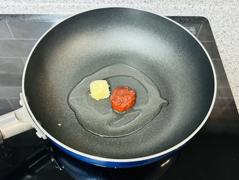 냄비에 식용유 한 바퀴와 다진 마늘 0.5T,
