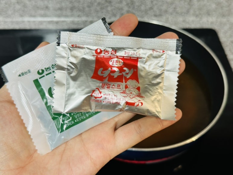너구리 분말스프, 건더기 스프를 넣어 끓여주세요